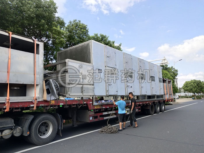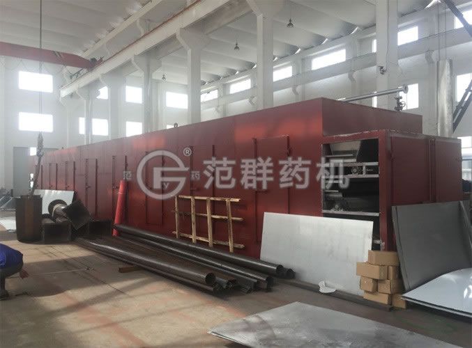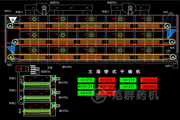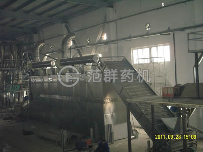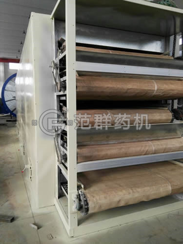 將所要處理的物料通過適當的加料機構(如星型布料器、擺動帶、粉碎機或造粒機),分布在輸送帶上,輸送帶通過一個或幾個加熱單元組成的通道,每個加熱單元均配有空氣加熱和循環(huán)系統(tǒng),每一個通道有一個或幾個排濕系統(tǒng),在輸送帶通過時,熱空氣從上往下或從下往上通過輸送帶上的物料,從而使物料能均勻干燥。
